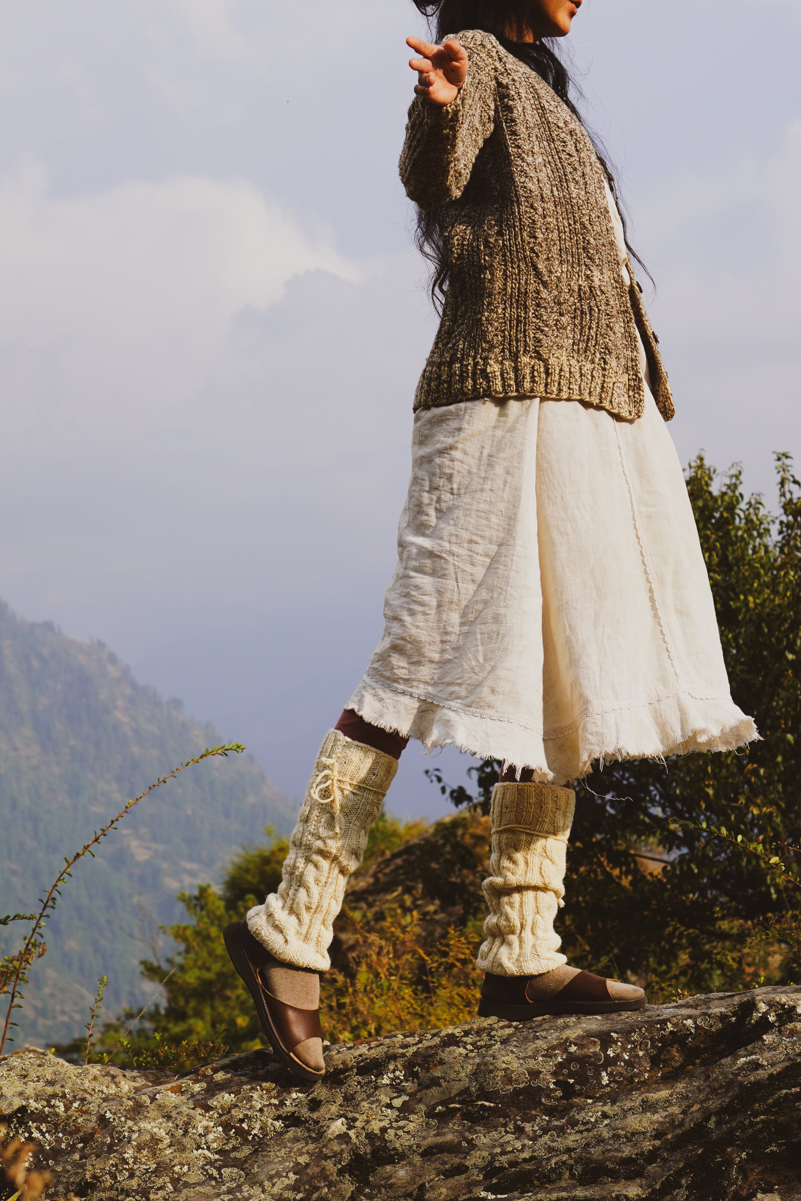Size :長さ-長 すねの周囲ー中 厚さー普通 Materials: ヒマラヤを遊牧された羊毛100% From India 2024年秋の刈り取り 詳細サイズ::長さー40cm すね周り48cm 重さー245g(糸紡ぎ7g/毎時間) 羊飼い―Rajuさん family in India ,Himachal Pradesh 洗い―Gitaさん Meshuさん 紡ぎ―Babnaさん 編み―Gitaさん BellaTerraのレッグウォーマーは、初めましての方にお勧めの大人気商品です。 茶色の羊は100頭に7,8頭ほどしかおらず、貴重なお色です。 激減しているヒマラヤの遊牧民によって遊牧された原種の羊の毛を、ヒマラヤの村の人たちと昔ながらの手作業で行い、薪で火を焚き、氷河から続いている小川で洗い、世界最古と呼ばれる糸紡ぎの方法で紡いだ細い糸を、6本撚りまとめ編んでいます。 手紡ぎの糸は空気を含むので6本重ねることで保温性・断熱性・耐久性がさらに増し、足を通した瞬間”贅沢”なフィット感や人の手で包まれるような温もりを感じると思います。 ヒマラヤの4000Mの高原を遊牧をされ健やかに育った羊の毛には、上質な油脂成分ラノリンが含まれます。 ラノリンには保湿の作用があり、一般的にウールはチクチクすると思われがちですが、肌触りも滑らかで静電気も気になりません。 自浄効果もあり汚れや匂いが気にならず、洗濯もほとんどしないというお客様の声を多くお聞きします。 【Bellaterra レッグウォーマー|選び方ガイド】 すべて 手紡ぎ・手編みのウールで作られています。 糸の太さや編み手の癖によって履き心地が異なりますので、以下のポイントを参考にご自身に合う一本をお選びください。 1. ご購入前の大切な注意点 伸縮性の強いゴムのような復元力はありません。 サイズが合わない状態で無理に履くと、伸びたまま戻らなくなります。 そのため、全ての商品に「履き口サイズ」を記載しています。 ご自身のふくらはぎの実寸を測った上で、合ったサイズのものをお選びください。 2. 履き口サイズの選び方 ☆ぴったりめの履き心地が好きな方 → ふくらはぎの実寸+1~2cm の履き口サイズ 使うほど自然に馴染み、ちょうど良いサイズ感になります。 ☆ 締め付けが苦手・ゆったり履きたい方 → 実寸より2〜3cm以上大きいサイズ 無駄に伸びず、長く快適にお使いいただけます。 ※ 着用を続けると少し緩みますが、洗うと収縮して戻ります。 3. 長さの選び方 ☆ 長めタイプ ・足首に自然なたるみが出て、ふんわり柔らかな印象 ・足首までしっかり温まり、保温力が高い ・履き口が実寸より大きめサイズ+長めを選ぶと もったり・ふわふわ とした雰囲気に ☆ 短めタイプ ・すっきり脚に沿う、コンパクトな印象 ・雨の日でも地面につきにくく、作業用など実用的な使い方がされたい方に ・履き口が実寸とほぼ同じサイズ+短めを選ぶと “靴下のようなフィット感” 4. あなたに合う組み合わせ(タイプ別のおすすめ) ① 長め × 履き口実寸より2〜3cm大きめ ふんわり柔らか、いちばん温かいタイプ。 ② 長め × 履き口実寸 軽くフィットし、しっかり温めたい方に。 ③ 短め × 履き口実寸 すっきり日常使い。雨の日にもおすすめ。 ④ 短め × 履き口実寸より2〜3cm大きめ ゆったり、締め付けなし。軽い着用感。 選び方の流れ(簡易チャート) 1.ふくらはぎの実寸を測る 2.締め付けが苦手 → 実寸+2〜3cm ぴったり好き → 実寸+1〜2cm 3.長め or 短めの好みで決める 手紡ぎ、手織りの羊毛100%ですので伸縮性がございません。 履き始めはフィット感が強くある様に感じても、2週間ほどで緩んで履きやすくなってまいります。 【ご購入の前に!!手紡ぎ、手編みの製品は工業製品と違う点が多くありますので、下記のご案内をご覧いただけますよう願いいたします。】 ・・・Bella Terra の毛糸の特質・・・ https://bellaterrawool.com/shop/bella-terra-2/ ・・・BellaTerraの製作工程はHP・・・ https://www.bellaterra.jp/ ・・・作り手さんの紹介のBlog・・・ ー Gitaさん ー https://bellaterrawool.com/%e3%81%bf%e3%82%93%e3%81%aa%e3%81%ae%e7%b4%b9%e4%bb%8b/gita/%e3%80%8c%e3%80%80%e9%81%ba%e4%bd%9c%e3%80%80%e3%80%8d%e2%81%a1%e2%81%a1/ 今日も羊飼いがヒマラヤを遊牧している。村の方が母から子へ受け継いだ技で、手仕事をしている。 文字や記録に残されることのない世界の遺産のような生き方が、今日も同じ地球のどこかで紡がれている。 山岳遊牧民族の暮らしを「どこか遠くのおとぎ話」でなくて身近に感じていただきたい。という願いを込めて。作り手のみんなを紹介しております。 【重要事項説明:商品購入前にお読みいただき、以下をご承諾の上ご購入くださいませ】 ・ゴムや化学的な調整具を使っていない為、一般的なレッグウォーマーのような伸び縮みをしません。 体に馴染むまで少々時間がかかりますが、着用しているとその方専用のサイズにニットが整っていきます。 ・表示サイズは平置きです。 ・手紡ぎの糸は若干の太さの違いがあります。表面のゆがみや毛羽になりますお気を付け下さい。 ・洗濯機で洗ったり、強くもみ洗いをしますと縮みます。ぬるま湯以下でもみ洗いをしてください。 ・大自然