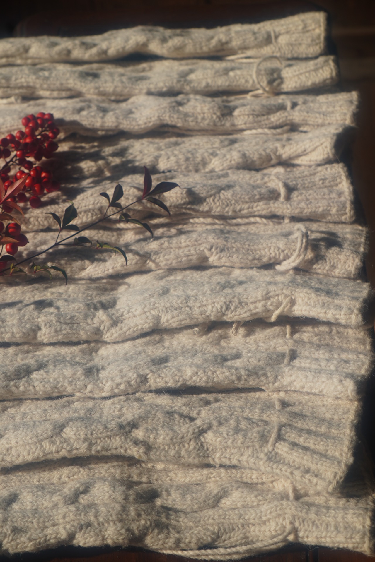 激減しているヒマラヤの遊牧民によって遊牧された原種の羊の毛を、ヒマラヤの村の人たちと昔ながらの手作業で行い、薪で火を焚き、氷河から続いている小川で洗い、世界最古と呼ばれる糸紡ぎの方法で紡いだ細い糸を、6本撚りまとめ編んでいます。