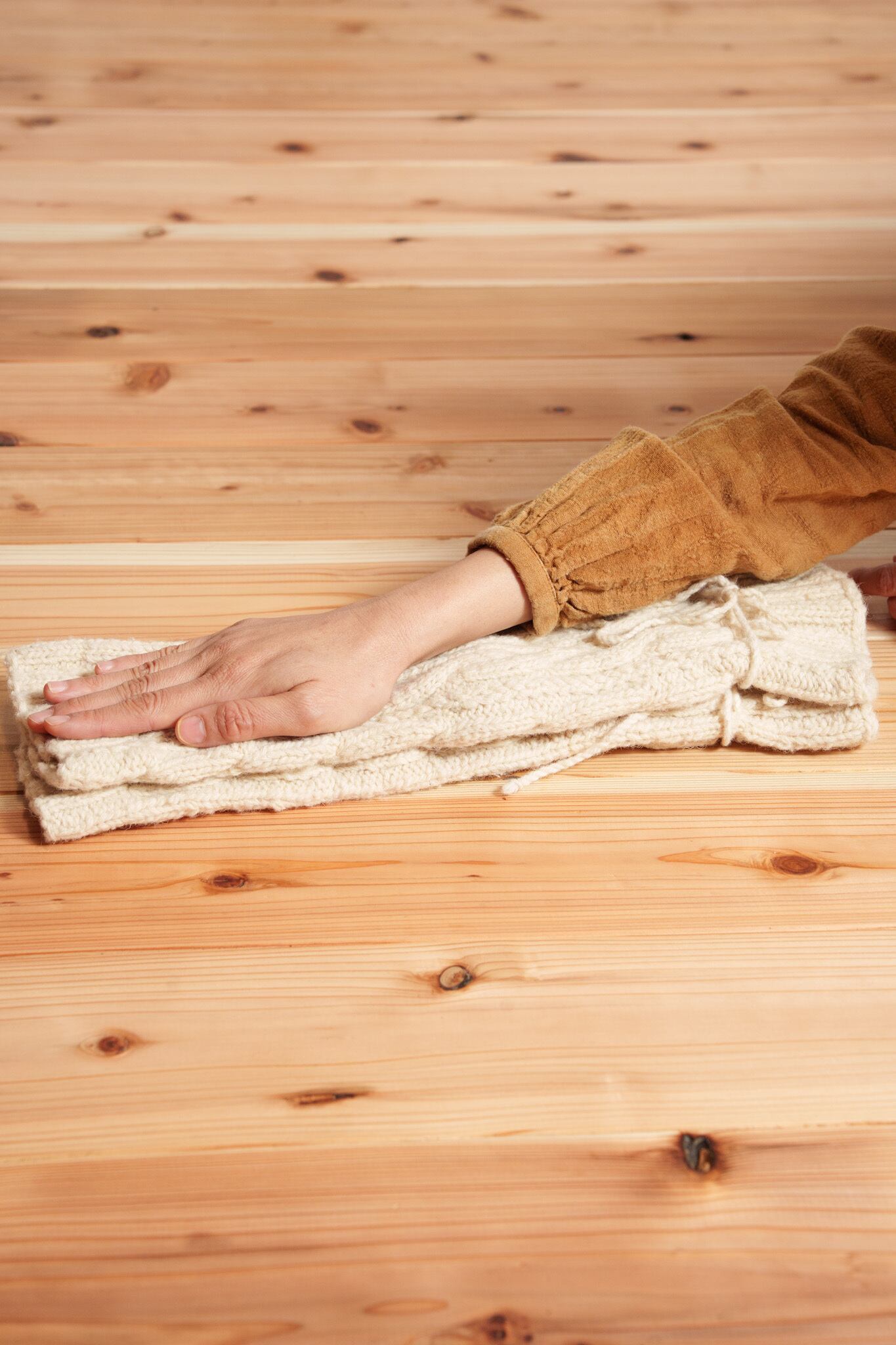 ・ゴムや化学的な調整具を使っていない為、一般的なレッグウォーマーのような伸び縮みをしません。