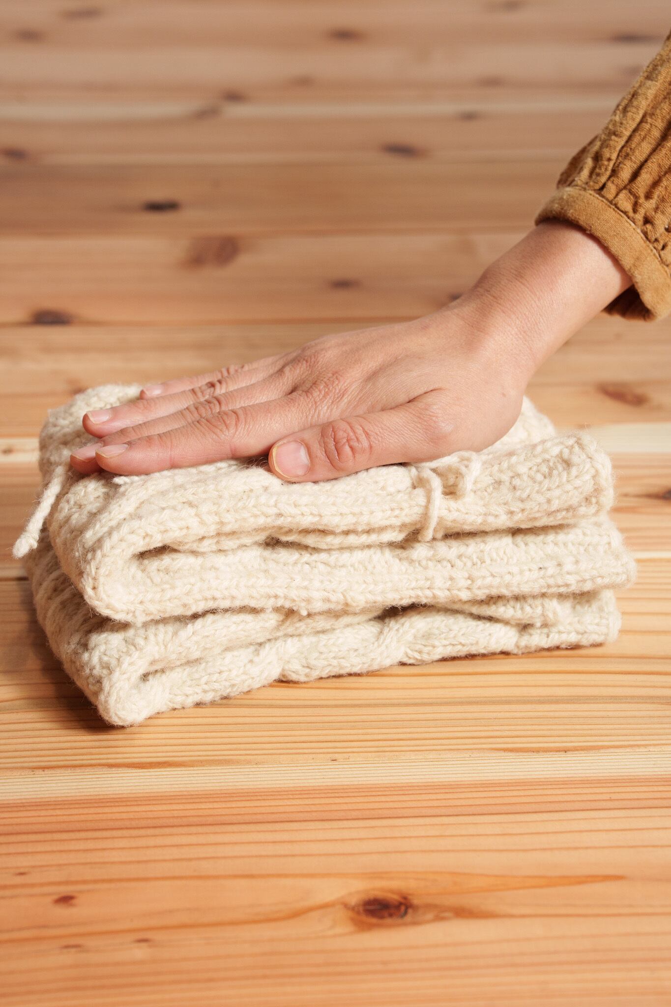 ・ウールニットを収納されるときは、同封のコットンバッグに入れて樟脳や香木ハーブなどで防虫してください。