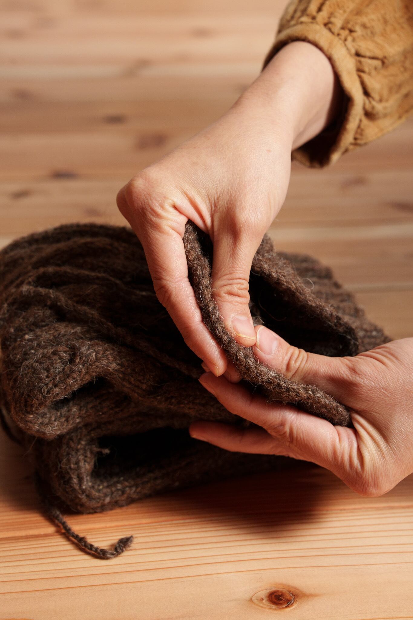 ・ウールニットを収納されるときは、同封のコットンバッグに入れて樟脳や香木ハーブなどで防虫してください。