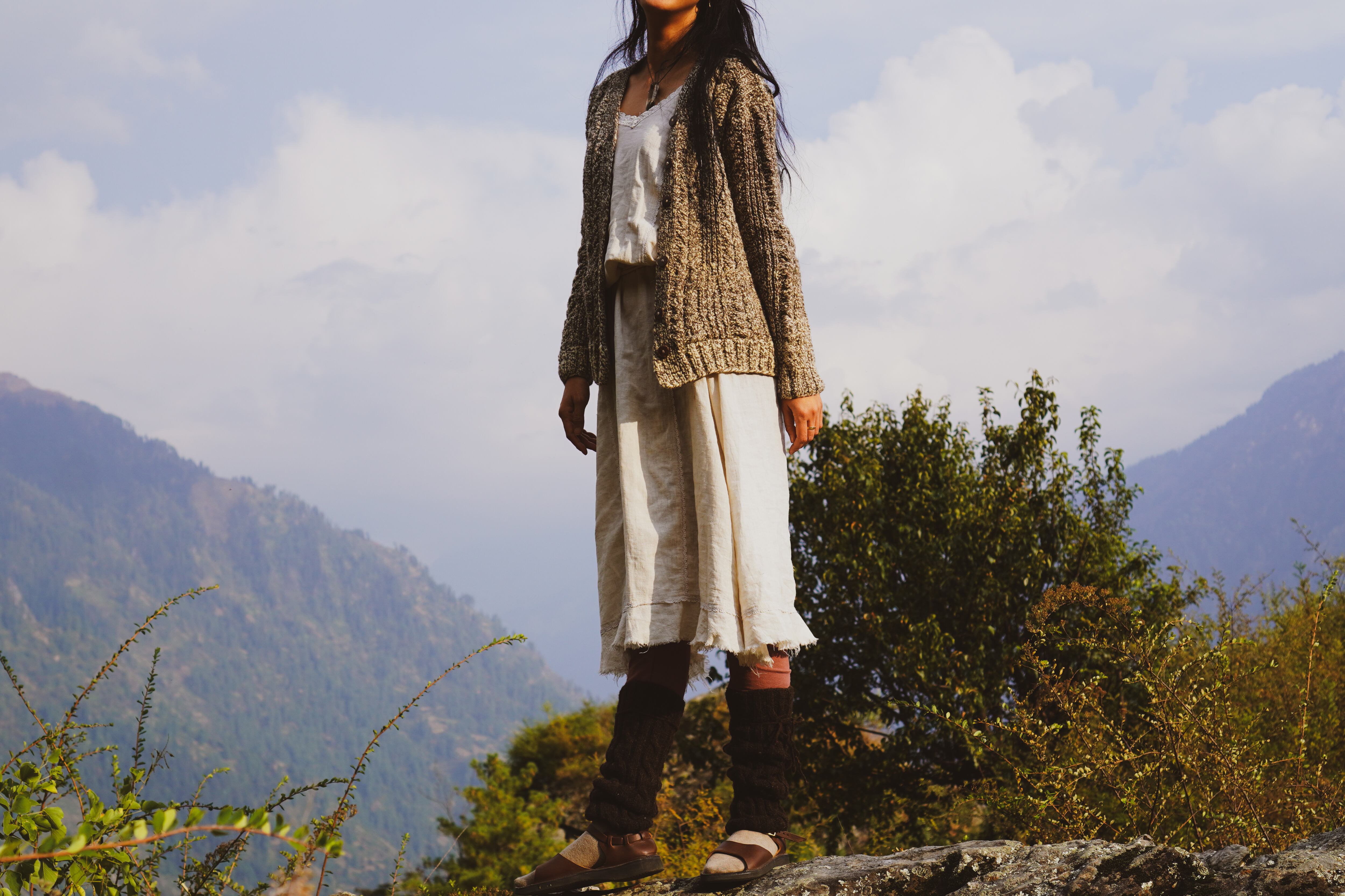 激減しているヒマラヤの遊牧民によって遊牧された原種の羊の毛を、ヒマラヤの村の人たちと昔ながらの手作業で行い、薪で火を焚き、氷河から続いている小川で洗い、世界最古と呼ばれる糸紡ぎの方法で紡いだ細い糸を、6本撚りまとめ編んでいます。