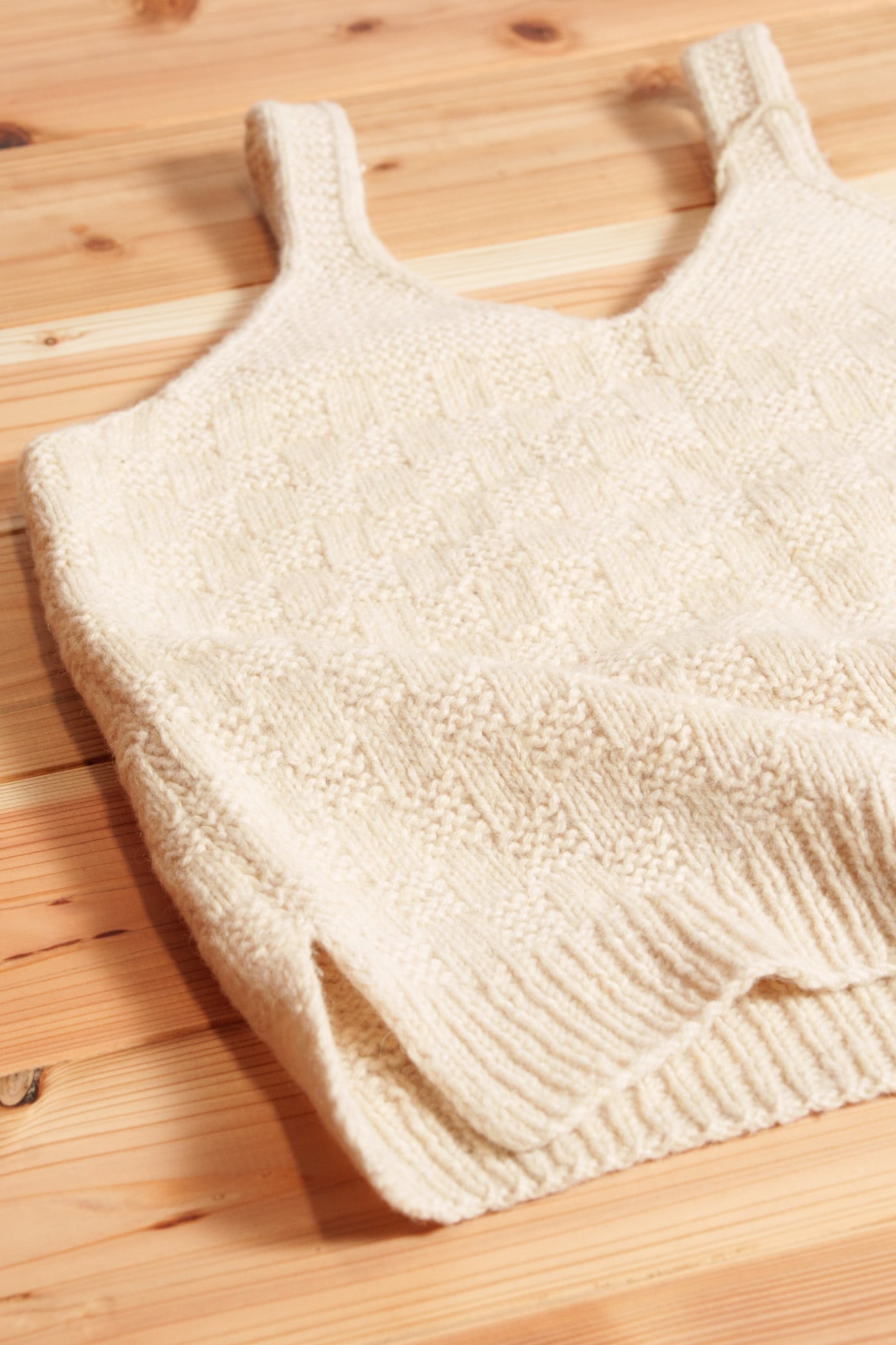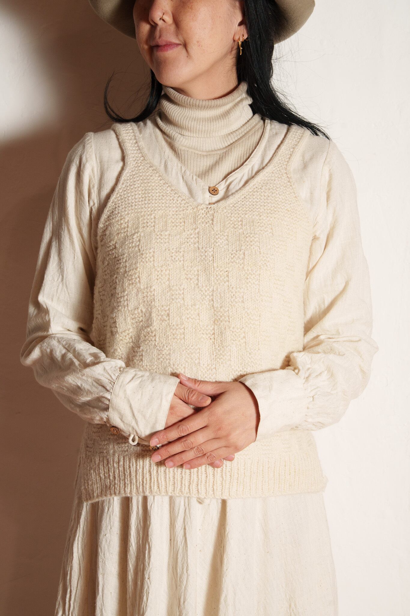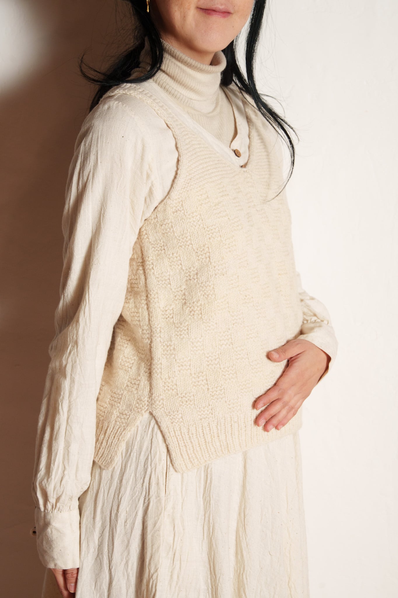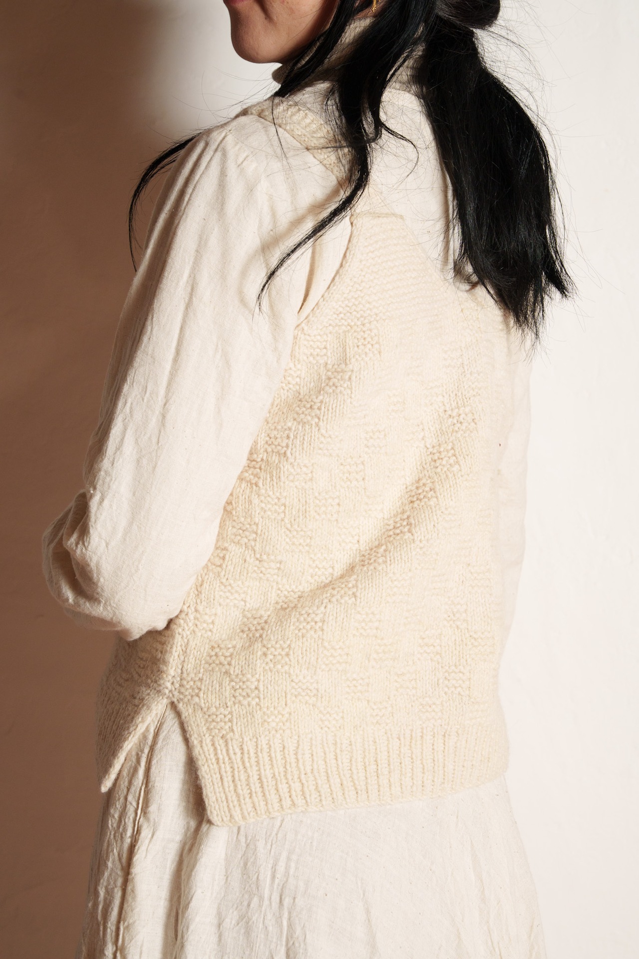 ②その上に、ウールのチョッキを着ます。