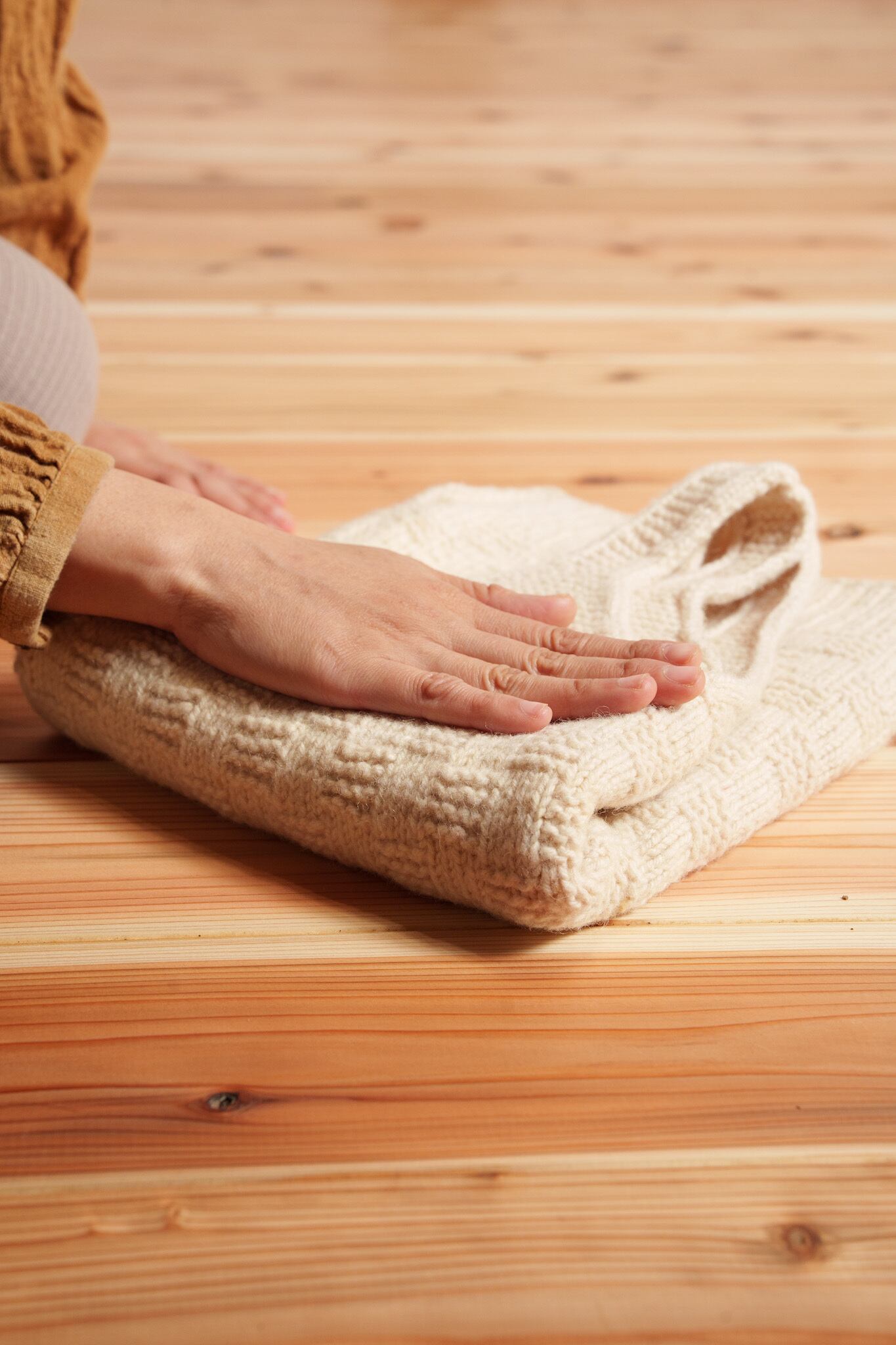 ・ウールニットを収納されるときは、同封のコットンバッグに入れて樟脳や香木ハーブなどで防虫してください。